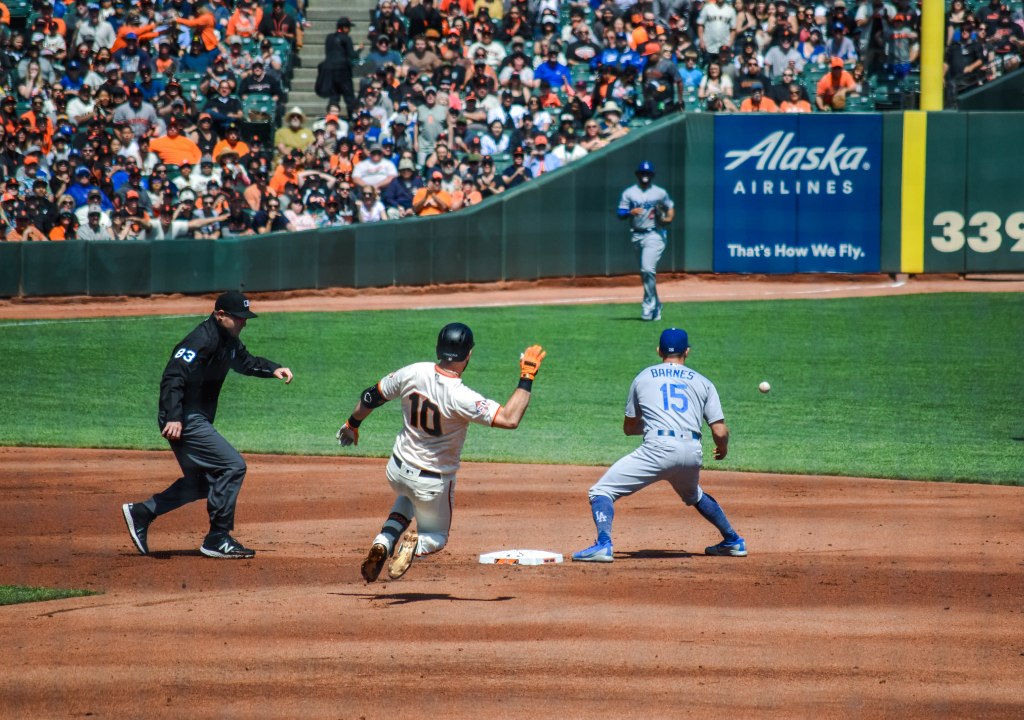 April 8, 2018 It was early in the year and the Giants had actually won more games than LA at this point. In the above image, new Giant Evan Longoria slides into 2nd base with a double in the bottom of the 2nd. Not the greatest moment of 2018, but a great shot. Longo would have 2 doubles in this game but the rest of the Giants would only tally 6 hits in a 2-1 loss. The Giants tied this game in the 8th on a Buster Posey RBI single to score Pence. However, Pierce Johnson would give up an RBI double to Kyle Farmer in the 10th and that was the ballgame. But this shot of Longo sliding as the umpire maneuvers to make the call while Barnes awaits the throw is pretty great.