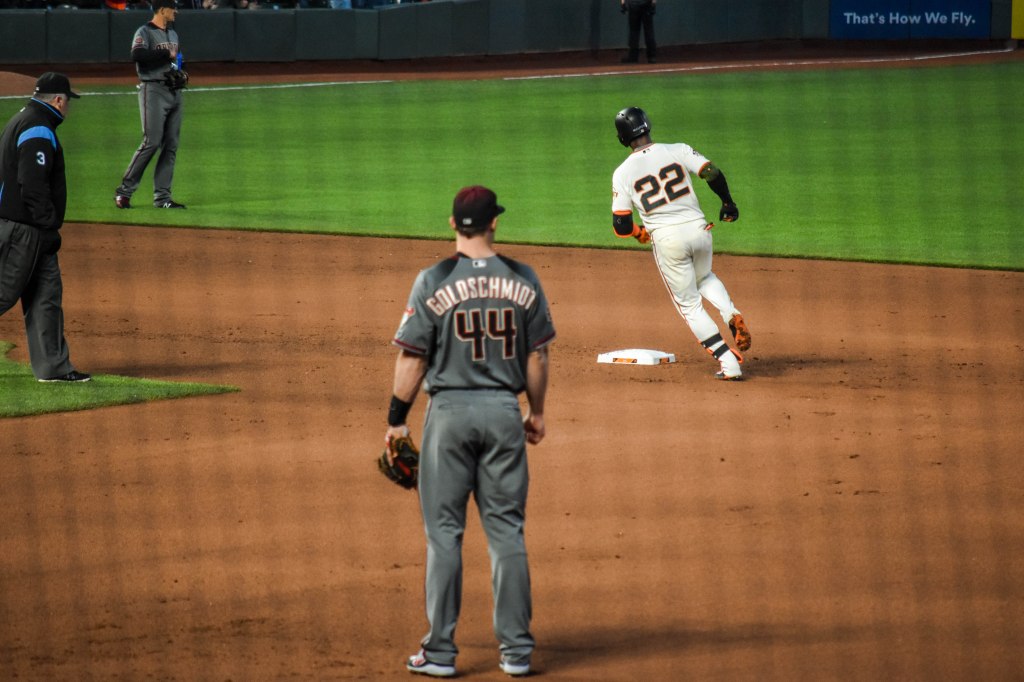 June 4, 2018 It was a good old fashioned beat down on the shores of McCovey Cove as the Giants knocked around Zack Godley (3.1 IP, 5 H, 7 ER, 2 BB, 3 SO). In this image, a stunned Goldy watches as Andrew McCutchen rounds the bases after leading off the 4th inning with his 5th HR of the year. In fact, the Giants would go back to back here as Craw hit one out in the next at bat. The Giants would go on to score 7 in the inning on a crazy series of plays: HR, HR, groundout, single, walk, walk, double, hit by pitch, wild pitch, double, strikeout, walk, popfly. It took 55 pitches to get the Giants out that inning. Fun times.