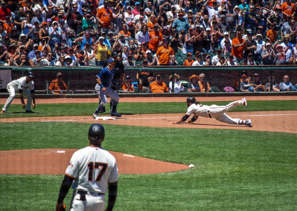 Saturday, June 23 It was a career day for Brandon Crawford in late June against San Diego. Seen here, B Craw dives headfirst into third base as his 4th inning triple scores Cutch from first and ties the game at 1. Craw would later hit a two run double and finish the day 3-3, 3B, 2B, Walk, 3 RBI, Run in a Giants 5-3 victory.