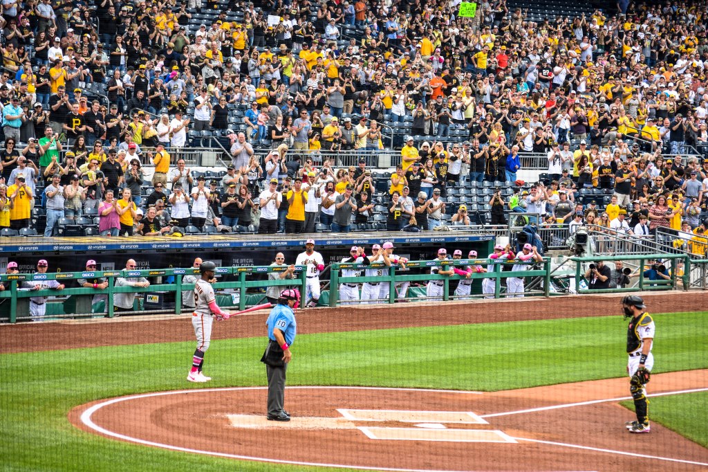 May 13, 2018 Yes, another one from Mother’s Day in Pittsburgh. Here, Andrew McCutchen gets a standing ovation from the home crowd before his first at bat. Notice catcher Cervelli giving him some room and time to soak it up. Cutch played the first 9 years of his career in Pittsburgh before being signed by the Giants that year. The Friday night game of this series was his first game back which I missed, but I was there for Saturday and Sunday’s games and he got a big hand every at bat. Absolutely beloved in Pittsburgh.