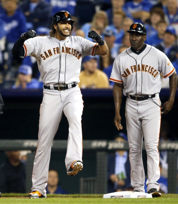 So the Giants have just given Tim Hudson a 2 run lead as he takes the mound in the bottom of the 2nd. The Royals have to feel deflated and that they have no chance now right? Well, Billy Butler will lead off and drive the 2nd pitch he sees into center field for a lead off hit. Then on the next pitch Alex Gordon drives one into the right center field gap to score Butler from 1st and it’s now 2-1 Giants with the tying run on 2nd and no outs! Then on the next pitch Hudson drills Salvador Perez right above his left knee and he has to take a few minutes to shake it off. This, as it turns out, gives Jeremy Affeldt more time to get ready in the bullpen. Salvy ends up limping down to first base with his trainer and Ned Yost as Mike Moustakas digs into the box. So after it took the Giants 15 pitches to score 2 runs, the Royals have now got one of those runs back and have the tying and go ahead runs on base after only 4 pitches from Hudson.