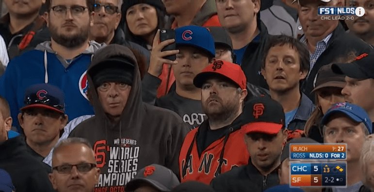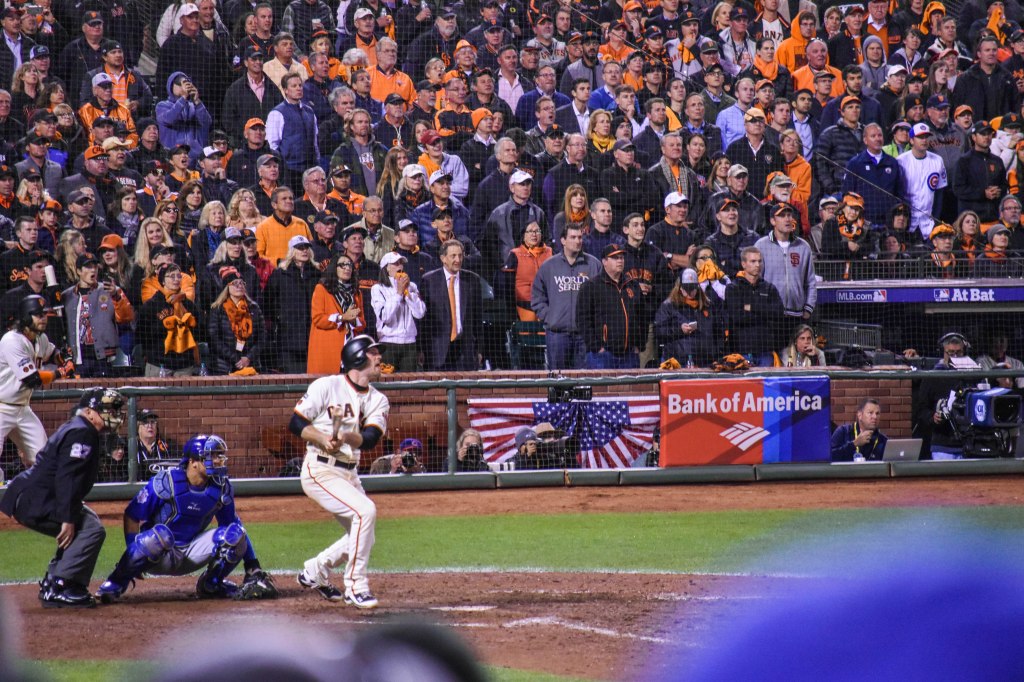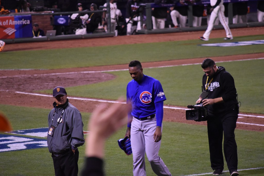 This was now the inning from hell. Our best guy just gave up a huge home run to the opposing pitcher and we were one loss away from going home. That big fly sucked all the air out of Giants fans lungs and the inning was still not over. What made it worse was that there was so many Cubs fans there. It felt like half the yard was cheering during Arrieta’s home run trot. It was awful with all of them in our house like that. Then to make it worse, Dexter Fowler would single on the very next pitch and Bumgarner would walk Kris Bryant on 4 straight balls!