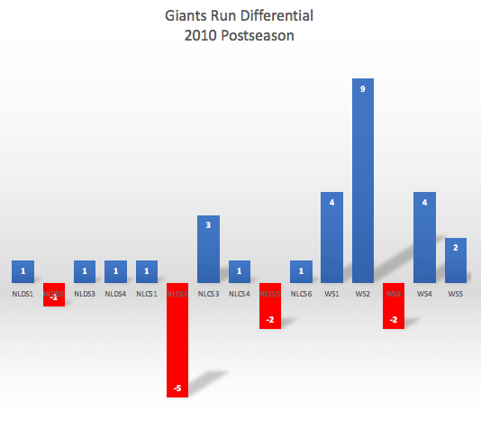 In the last two World Series runs, in Game 1 the Giants have outscored opponents 19-10. Also the Giants 8 runs in this game would be more than the Tigers would score the entire series. Think about that. The Giants held the Tigers scoreless from the beginning of Game 2 through the 2nd inning of Game 4.