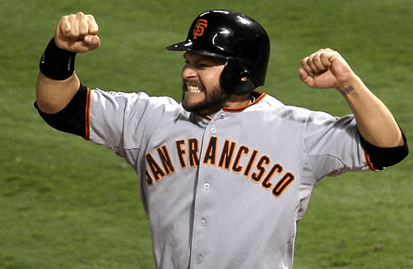 The bottom of the 3rd could have been far less fun without a great at bat from MVP Buster Posey. Buster came up with guys on 2nd and 3rd and nobody out (my favorite scenario). It would be very easy for a guy to come to the plate in this situation and try to do too much and end up striking out. But not Buster. This at bat started with a meeting on the mound about how to approach the Giants catcher. First pitch too him was low and away for a ball. Easy take for Buster and a gift. Buster has a big swing and miss on the 2nd pitch and fouls it off, 1-1. He was just under that one. The 1-1 is an offspeed pitch outside for ball 2. The 4th pitch of the at bat is the same pitch as the 3rd and the count runs to 3-1. Not giving in to a fastball, Lohse throws another offspeed pitch is fouled away. The final pitch of the at bat is a fastball way outside for the walk, loading the bases for Pence. It doesn’t seem like a great at bat in the scheme of things, but a younger or more aggressive batter might have swung at a couple balls right there and struck out or popped up. The fact that Buster only swung at strikes and was patient in such a huge spot really shows his intelligence in the box. You have Pence on deck, these runs aren’t up to you. Just keep the line moving. Although the Pence at bat is what everyone will remember, Buster allowed it to be as huge as it was. Plus Pence’s AB was only 1 pitch while Buster saw 6. Way to be, Bust!