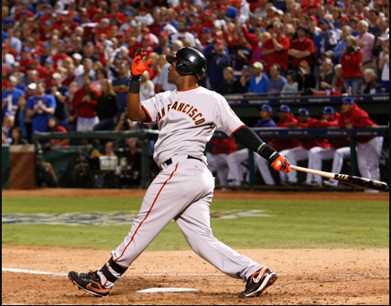 To start the inning Lincecum ran the count to 3-1 to Young and then he hit a line drive shot down the left field line that landed in the front row foul. That was scary. Almost a lead off double. On the full count pitch Timmy came back with a fastball and Young hit it on the ground into center for the Ranger’s first hit. Now he’s on first base for Hamilton and nobody’s out. This is the best opportunity all game for Texas and Hamilton battled, fouling off nasty stuff from Timmy. He fouled off 5 balls in a row before swinging and missing on the 7th pitch of the AB. A great sequence by Lincecum. But we weren’t out of the woods yet. In stepped the Hall of Famer Vlad Guerrero who could hit any pitch in any location out. But this was our year and Guerrero hit a little first pitch tapper to Renteria’s right who made a nice play and got the force at 2nd. What a gift!
