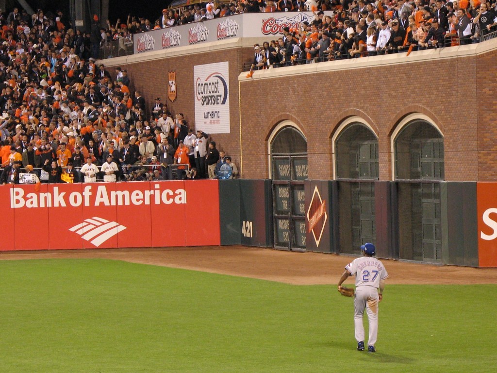 It split Murphy and Hamilton perfectly. With 2 outs that’s at least scoring 2 if it bangs off the wall. But it never banged off the wall. It carried over and the Giants had a 3-0 lead in the 7th. I gotta say we lost it in the bar at that moment. It was so tense all game and then suddenly you had a 3 run cushion with Timmy being Timmy on the mound. Life was good. Edgar’s home run barely, and I mean barely got out. It must have scraped the back of the wall as it didn’t even make the first row. It just kind of disappeared into history under the bleachers. He received quite the hero’s welcome in the dugout, especially from Pat Burrell who couldn’t hit a beachball that series. Then on the next pitch Aaron Rowand flied out to right field and then the entire stadium of 52,000 had to stand and sing God Bless America 60 seconds after their hearts had been ripped out. It must have been the least enthusiastic rendition of that song in the history of American sports. But those next 2 innings were pure joy for Giants fans.