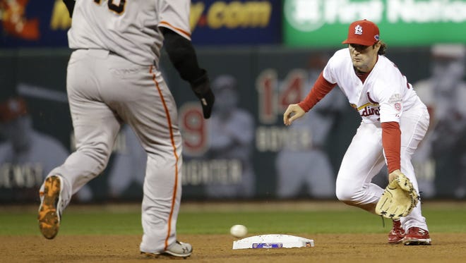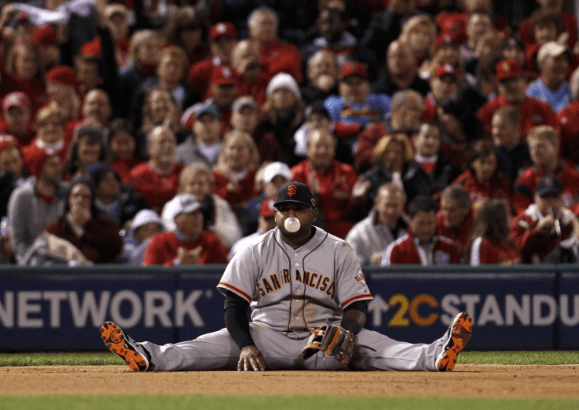 Entering the top of the 4th inning, Lance Lynn was dealing. He was at 38 pitches and had struck out 4 Giants in a row and had yet to give up a hit. But that was all about to change and it was started with the series MVP Marco Scutaro. On a 1-2 count Scutaro lined one into right field for the Giants first hit of the game. Then came the soon to be World Series MVP Pablo Sandoval and he rips the 2nd pitch of the at bat into right field as well and it’s 2 on and nobody out for the season MVP Buster Posey. What could be better? Well, Posey would strike out on 3 pitches, Lynn’s 6th strike out. Now, Hunter Pence has never been an MVP, but he was about to good things regardless! Hunter takes ball 1 and Molina jogs out to the mound. After a chat, Lynn throws another sharp breaking ball that Pence drills foul down the left field line. Pence looks hitterish, ready to go. The 50th pitch of the game is a swing and a miss by Pence on a slider that was 6 inches outside. Now it’s 1-2. Lynn fires a fastball right in the same spot as the slider but Pence takes and it’s a ball, 2-2. Then something magical happened. It was on the very next pitch that the rest of the postseason went the Giants way. It’s not often you can pinpoint these things, but when I look back on it, this was the play where it all changed. Lynn, always looking really sweaty had 2 strikes on Pence and on the 5th pitch of the at bat, Pence hits a soft little chopper that Lynn comes off the mound and makes a play on. With Panda’s speed at first, he’s got time to throw to second base and that’s exactly what he does: throws the ball right at second base. The base. And no one’s there! The ball bounces off the base and rolls into shallow center field. Scutaro scores easily, and Panda, after colliding with Kozma, takes third and it’s 1-0 Giants. A bizarre play you may never see again.